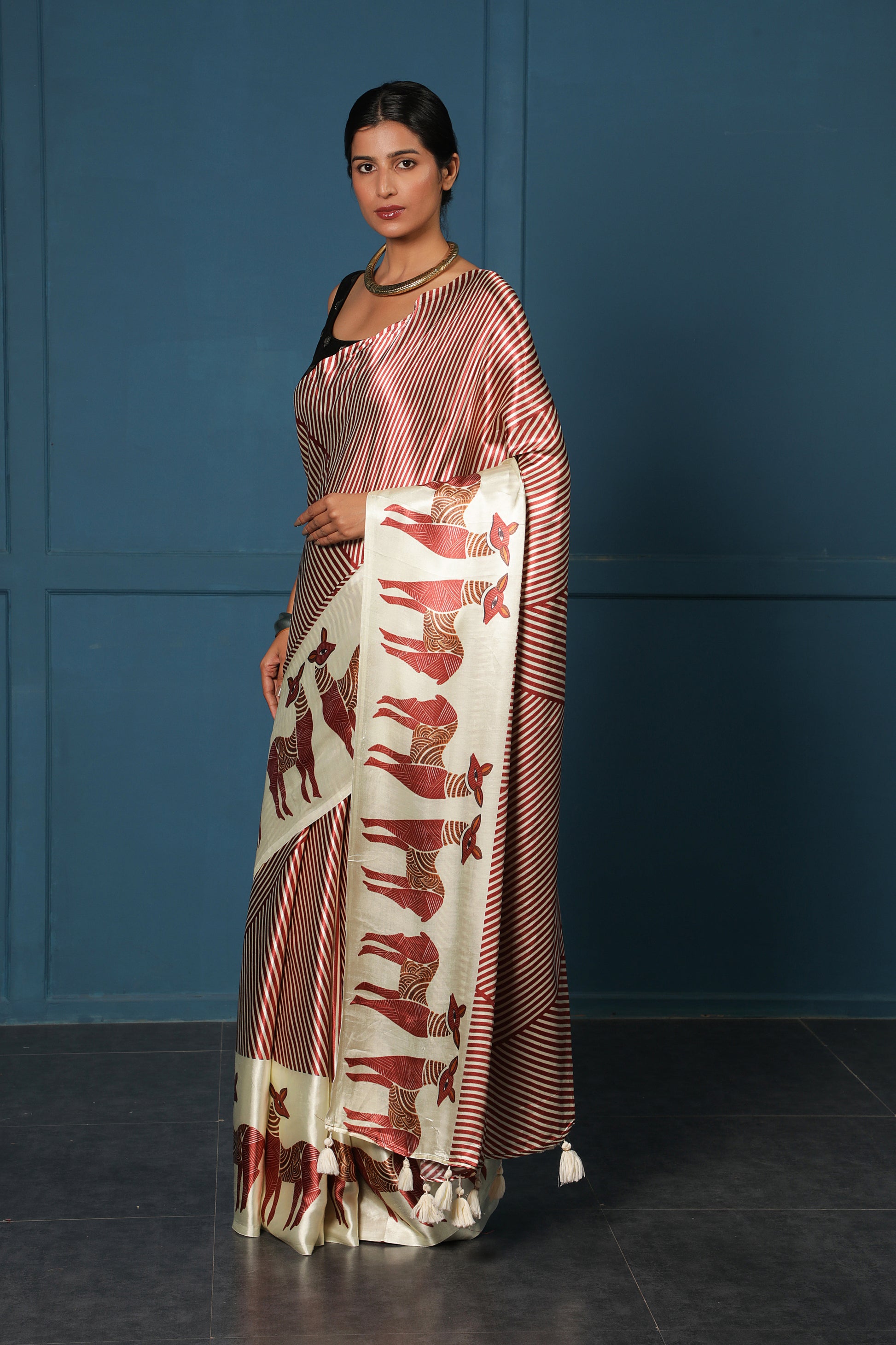 A muted beige saree with geometric textured patterns across the body, finished with a bold brown striped blouse print . The border is highlighted with a row of stylized deer motifs in earthy brown, giving this drape a rustic yet elegant charm.