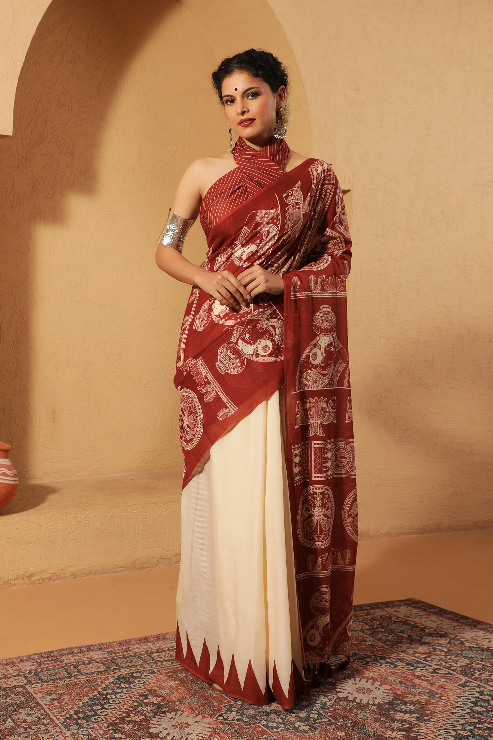 This saree, inspired by Madhubani artwork, features an elegant cream body framed with geometric triangular edges and a striking maroon pallu adorned with intricate motifs of chariots, fishes, and traditional figures in earthy beige. A perfect blend of heritage symbolism and artisanal detailing, this drape celebrates the epic narratives of Mithila art in a bold yet graceful design.