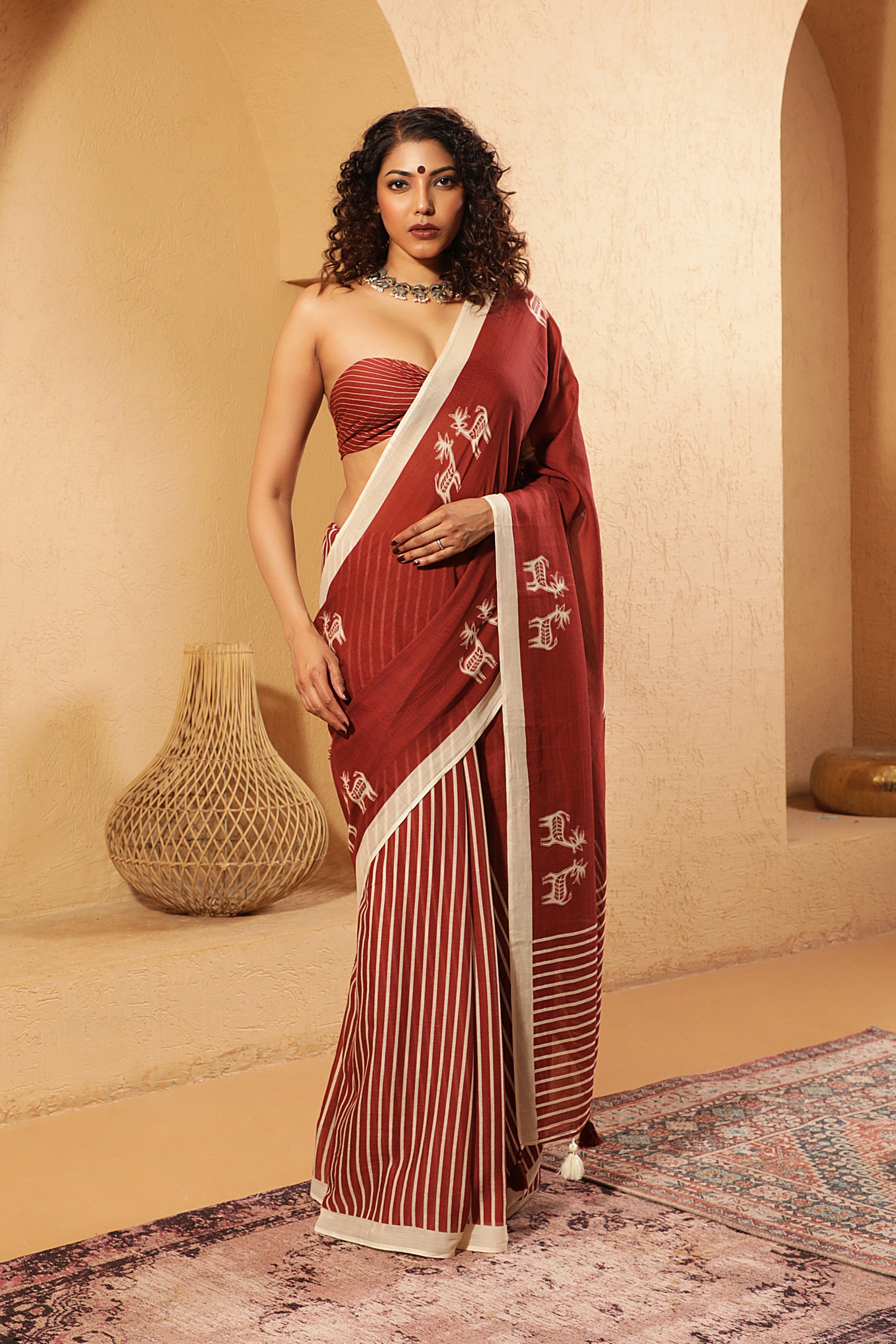 This deep maroon saree celebrates the essence of Sohrai tribal art with scattered ivory deer motifs across the pallu, evoking rustic charm and storytelling from rural life. The saree is balanced with a bold striped pallu and body adding structure to the fluid folk design. Minimal yet impactful, it blends tribal symbolism, earthy tones, and contemporary elegance, making it ideal for cultural occasions or artistic dressing.