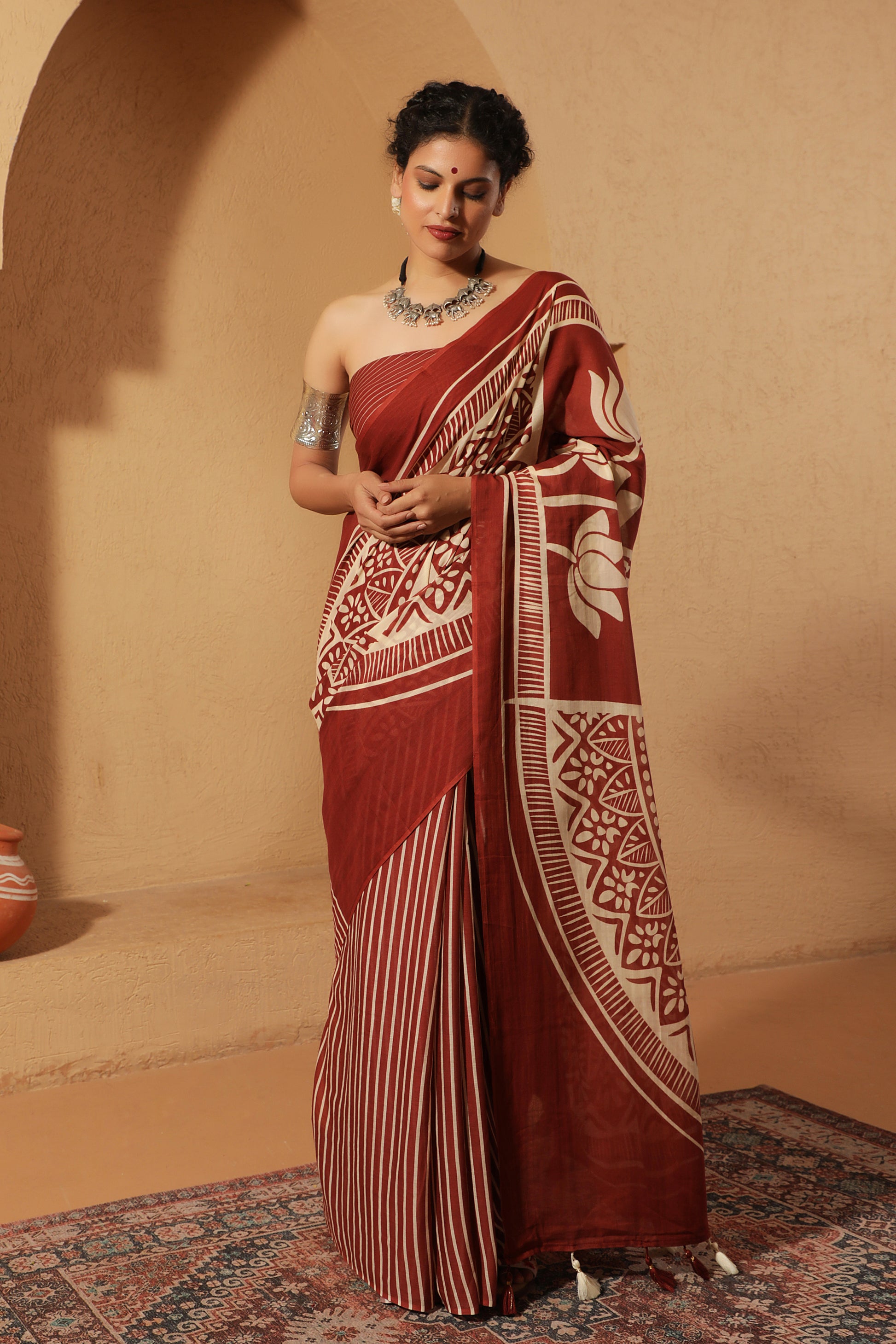 A rich maroon drape adorned with intricate Madhubani-inspired artwork. The pallu features a detailed mandala framed with floral lotus motifs in cream, adding a touch of heritage elegance. Vertical stripes run along the body, balancing tradition with contemporary finesse. A perfect statement piece for art and culture lovers.