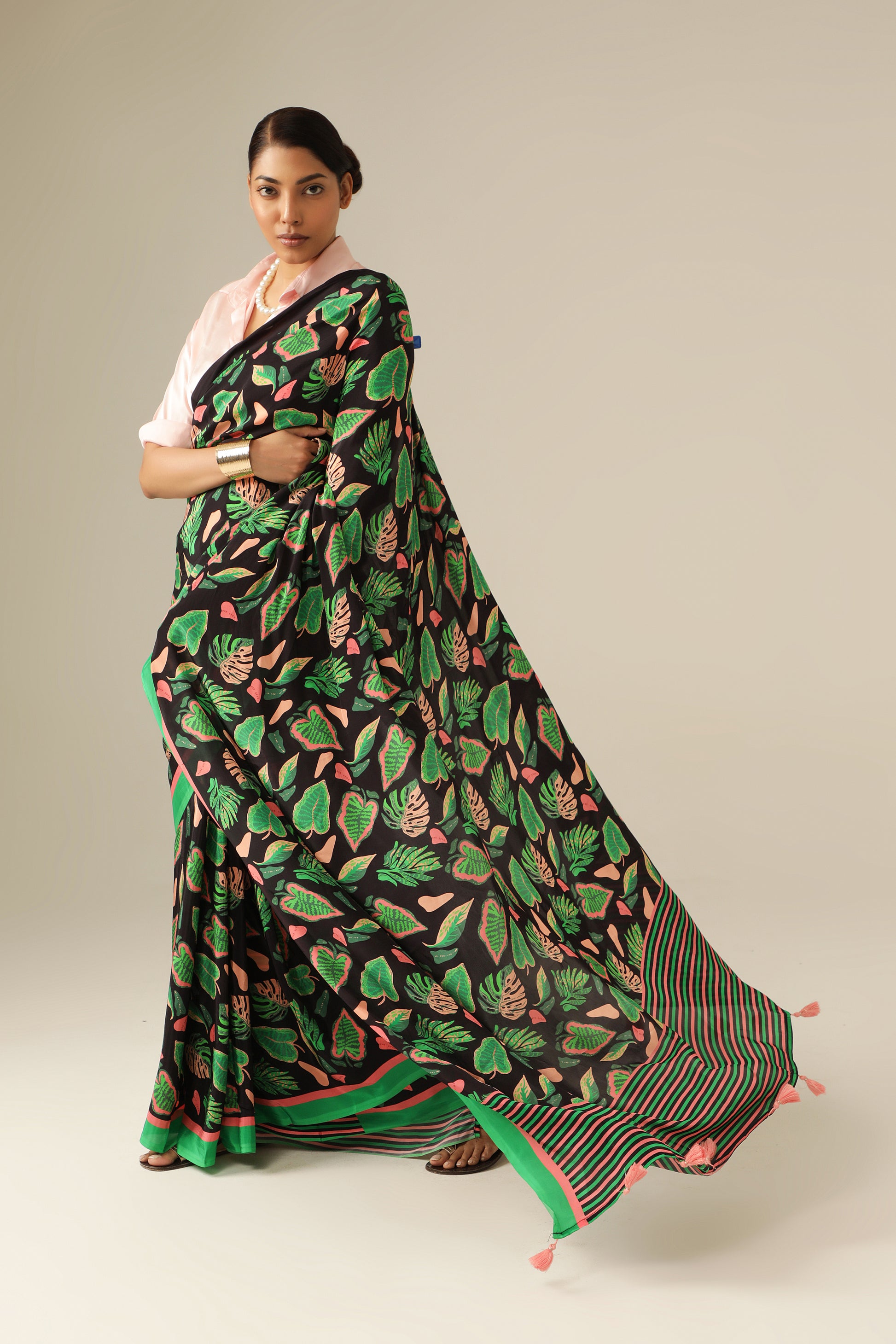 A deep black base saree covered with dense green leaf motifs accented in soft pink, creating a rich all-over foliage effect. Finished with soft pink and green striped pallu and subtle borders, and thin pink and green striped print blouse for contrast. this saree blends bold nature-inspired design with contemporary elegance.