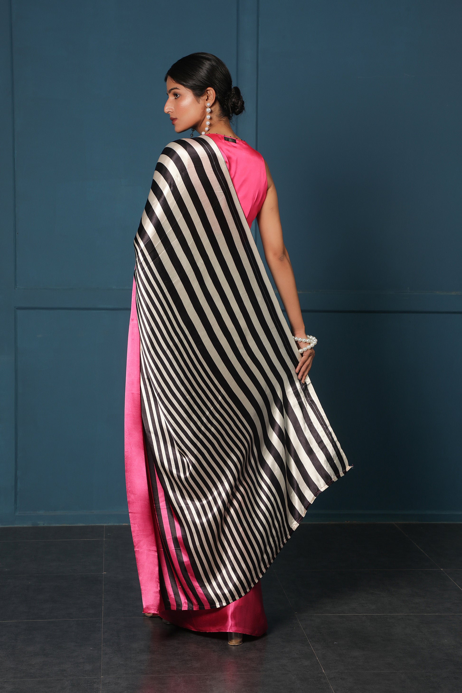 A bold magenta saree featuring dramatic black-and-white horizontal stripes across the drape, balanced with magenta accents. A contemporary statement piece blending vibrant color with graphic modernity.