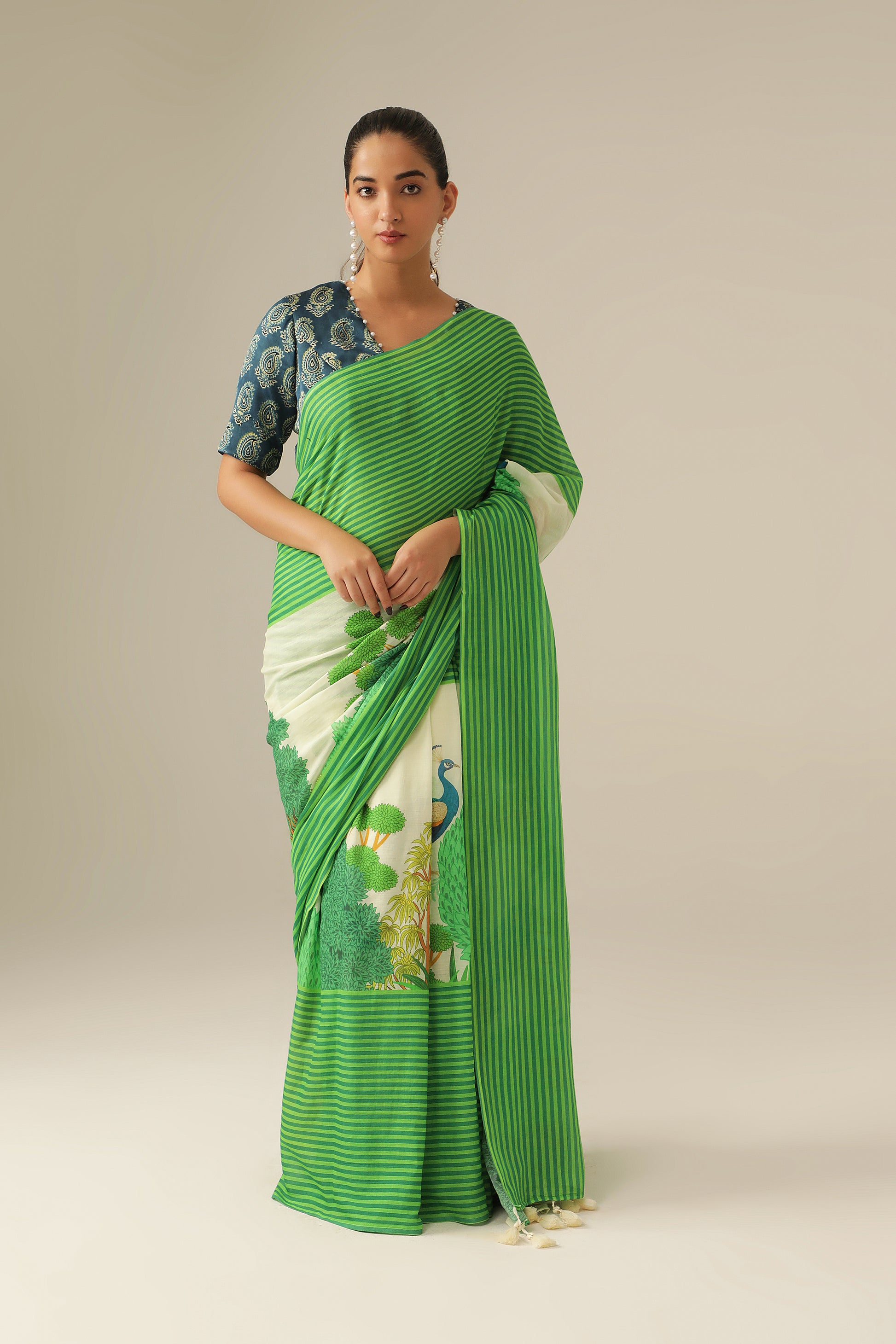 A fresh green saree with bold striped borders, featuring a scenic panel of lush trees and foliage adorned with elegant peacocks in shades of blue and teal. A graceful drape that celebrates nature’s beauty with regal charm.
