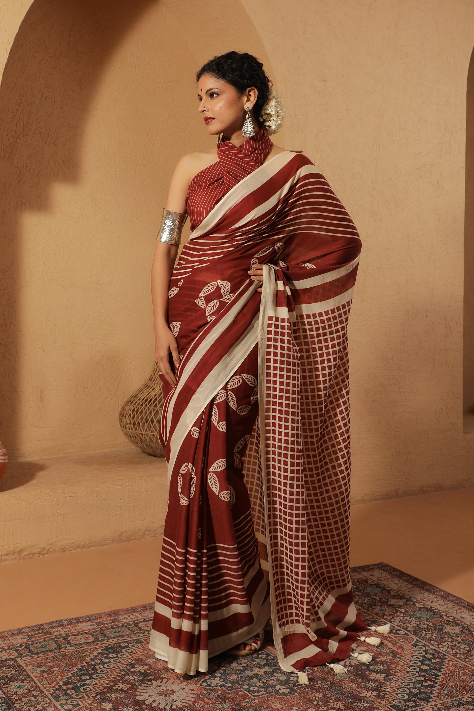 Rooted in Sohrai art traditions, this saree showcases a deep maroon base accented with geometric floral motifs arranged in rhythmic symmetry. The design is framed with striped borders and complemented by a contrasting checkered pallu, adding layers of texture and cultural richness. With its folk-inspired detailing, earthy tones, and structured layout, this saree is a statement of tribal elegance with modern charm.